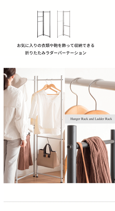 ・ブラック ・ライトグレー ロングコートやワンピースも収まる高さの ハンガ―ラックとカバンや ストールなどを掛けられるラダーラックが 一つになった便利なラダーパーテーション 『CULORU(クロル)』 バーの位置は4段階でお好みの位置に取り付けられるので ボトムやカバンなどお気に入りを魅せながら収納可能。